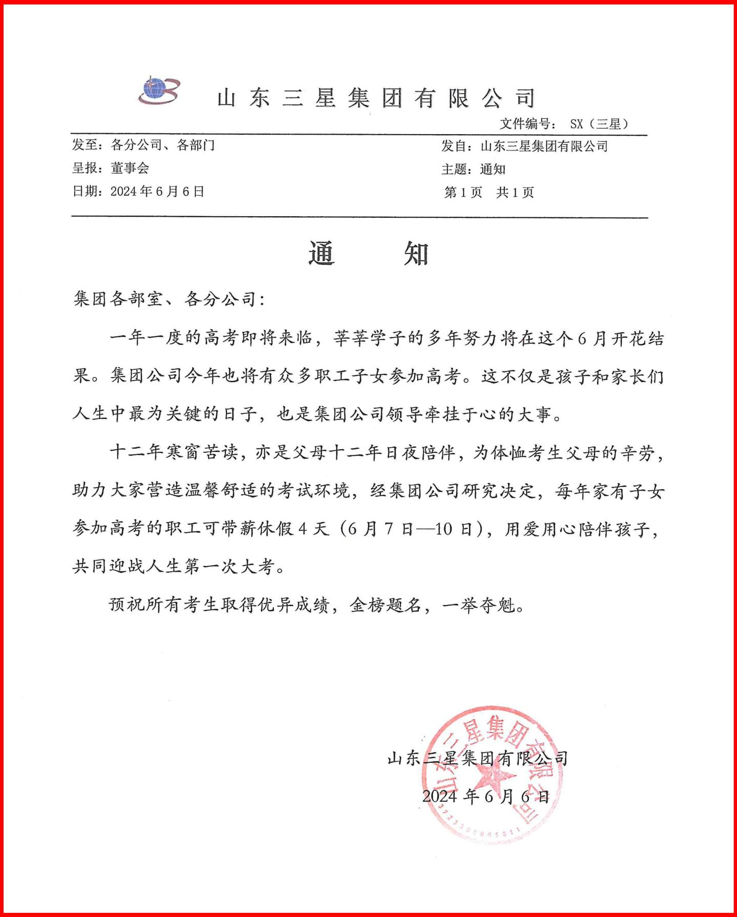 十二年寒窗苦讀,亦是父母十二年日夜陪伴,為體恤考生父母的辛勞,助力大家營造溫馨舒適的考試環(huán)境,經(jīng)集團(tuán)公司研究決定,每年家有子女參加高考的三星職工都可帶薪休假4天(6月7日—10日),用愛用心陪伴孩子,共同迎戰(zhàn)人生第一次大考。