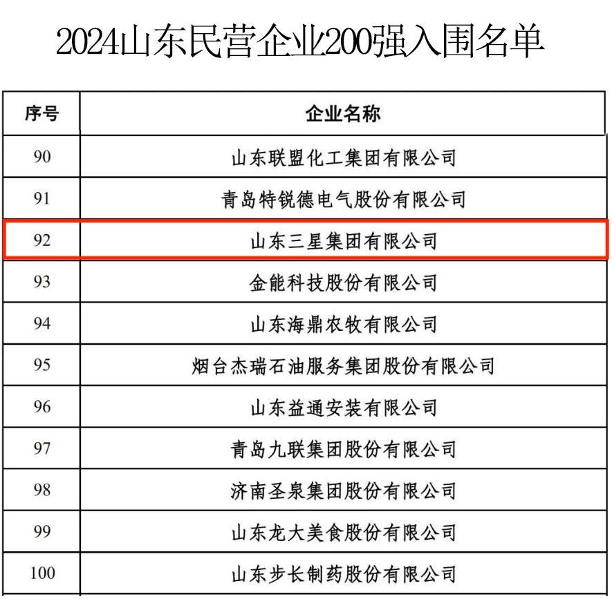 近日,山東省工商聯(lián)公示了2024山東民營(yíng)企業(yè)百?gòu)?qiáng)系列榜單入圍名單。山東三星集團(tuán)憑借雄厚的產(chǎn)業(yè)實(shí)力、強(qiáng)勁的發(fā)展?jié)摿蛷V闊的市場(chǎng)前景,入圍2024山東民營(yíng)企業(yè)200強(qiáng)名單。