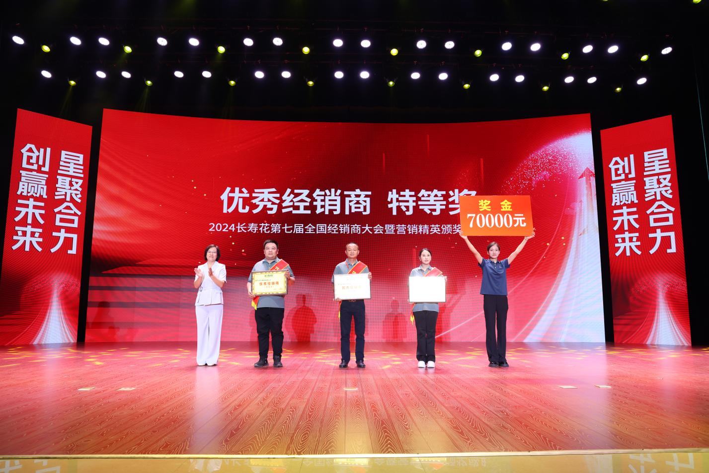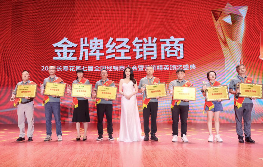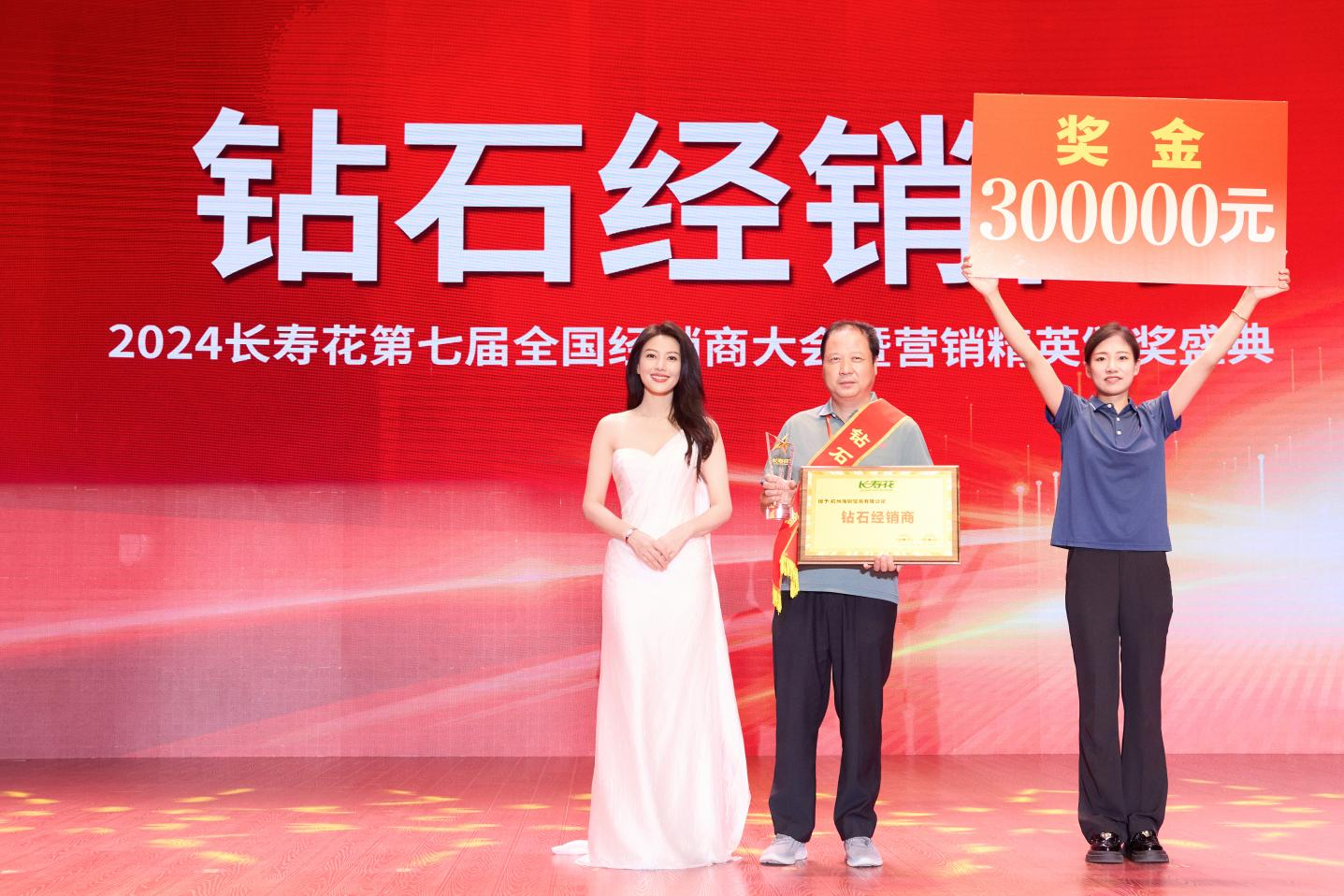 頒獎(jiǎng)盛典上,長壽花食用油代言人高圓圓為金牌經(jīng)銷商和鉆石經(jīng)銷商頒獎(jiǎng),并現(xiàn)場溫馨互動。