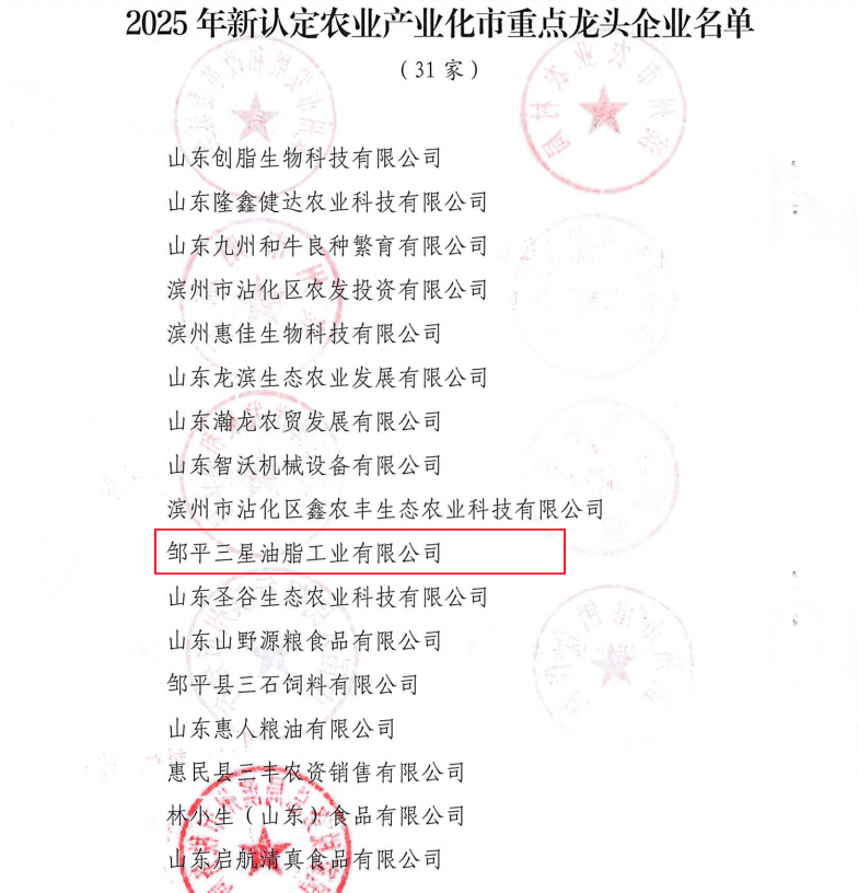 近日,濱州市農(nóng)業(yè)農(nóng)村局等聯(lián)合發(fā)布了2025年新認(rèn)定農(nóng)業(yè)產(chǎn)業(yè)化市重點(diǎn)龍頭企業(yè)名單,鄒平三星油脂工業(yè)有限公司憑借其在糧油加工領(lǐng)域的卓越實(shí)力和行業(yè)領(lǐng)先地位,入選該名單。