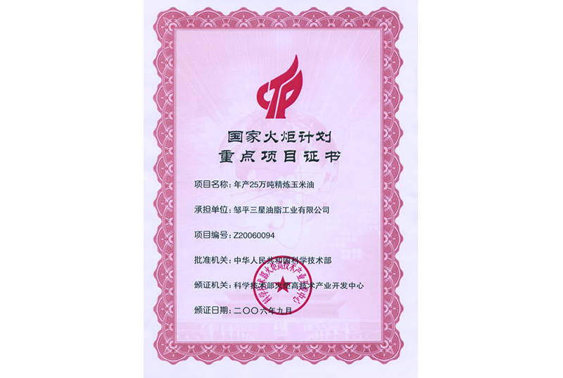 國家火炬計劃重點項目證書